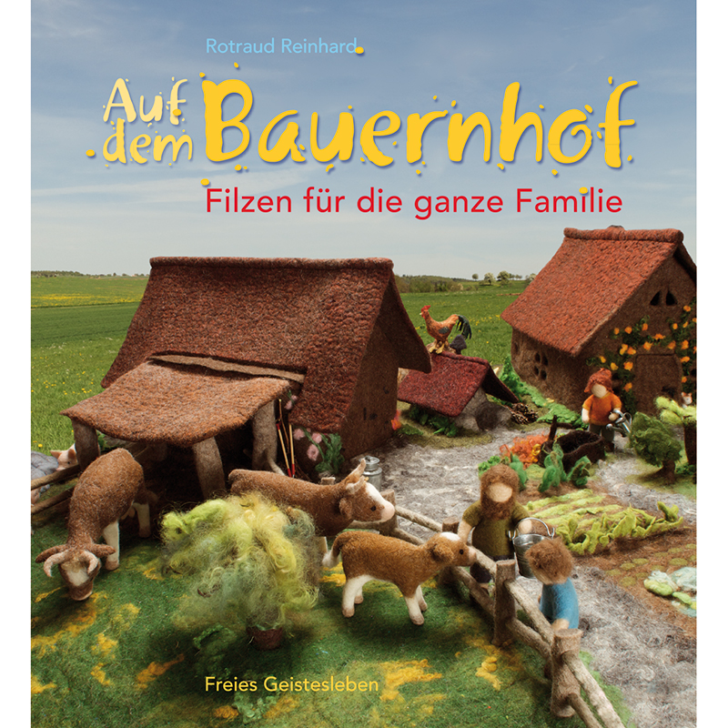 Na farmě - Filcování pro celou rodinu. Kniha od Rotrauda Reinharda obsahuje podrobné pokyny a krásné barevné fotografie, které ukazují, jak vytvořit celou farmu s řadou plstěných zvířat, lidí a nástrojů, stejně jako vlastní farmářský dům. Kniha v německém jazyce.