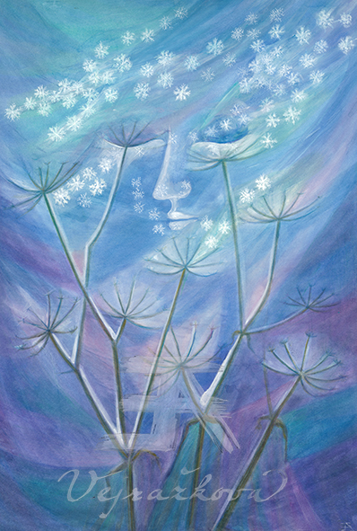 Tisky obrazů Evy Verjažkové, vytvořených vrstveným akvarelem, vznikaly během mnoha let. Autorka o svých obrazech píše: Vrstvený akvarel je časové náročná technika, která vyhovuje mému požadavku na rozsvícení barvy. Jemné závoje barev v rostlinných, figurálních a krajinných motivech vrstvím až do hlubokých, intenzivních tónů , aniž by barvou přestalo prostupovat světlo. U rostlinných motivů jsem v barevných skvrnách, obklopujících hlavní motiv, postupně začala objevovat elementární bytůstky, které stačilo jen zachytit.
