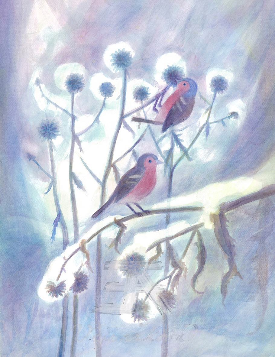 Tisky obrazů Evy Verjažkové, vytvořených vrstveným akvarelem, vznikaly během mnoha let. Autorka o svých obrazech píše: Vrstvený akvarel je časové náročná technika, která vyhovuje mému požadavku na rozsvícení barvy. Jemné závoje barev v rostlinných, figurálních a krajinných motivech vrstvím až do hlubokých, intenzivních tónů , aniž by barvou přestalo prostupovat světlo. U rostlinných motivů jsem v barevných skvrnách, obklopujících hlavní motiv, postupně začala objevovat elementární bytůstky, které stačilo jen zachytit.