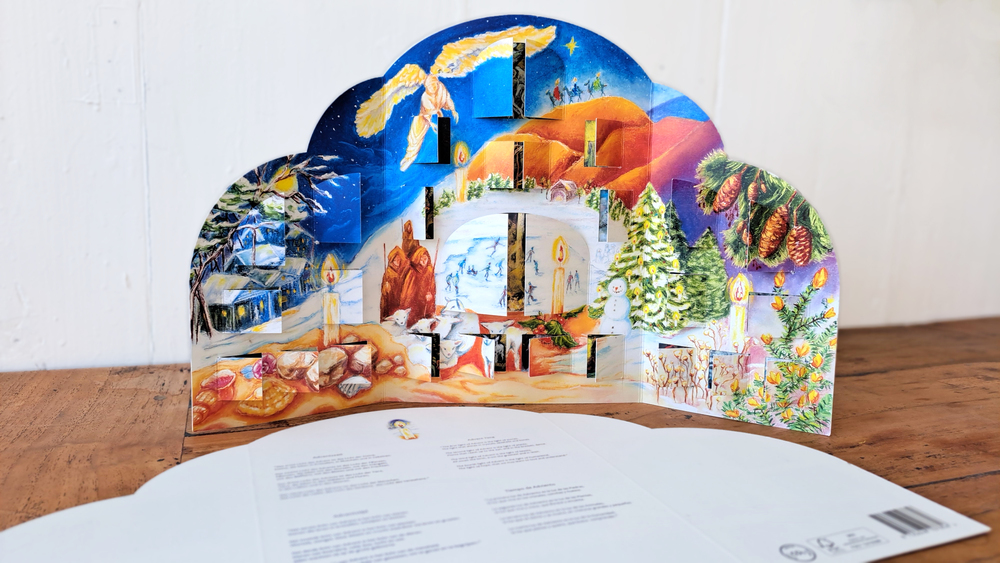 Krásný, velmi umělecky pojatý adventní kalendář s 25 okny - adventní pouť od prvého adventního dne až do Štědrého dne. 25. den - Betlém. Lze použít opakovaně.