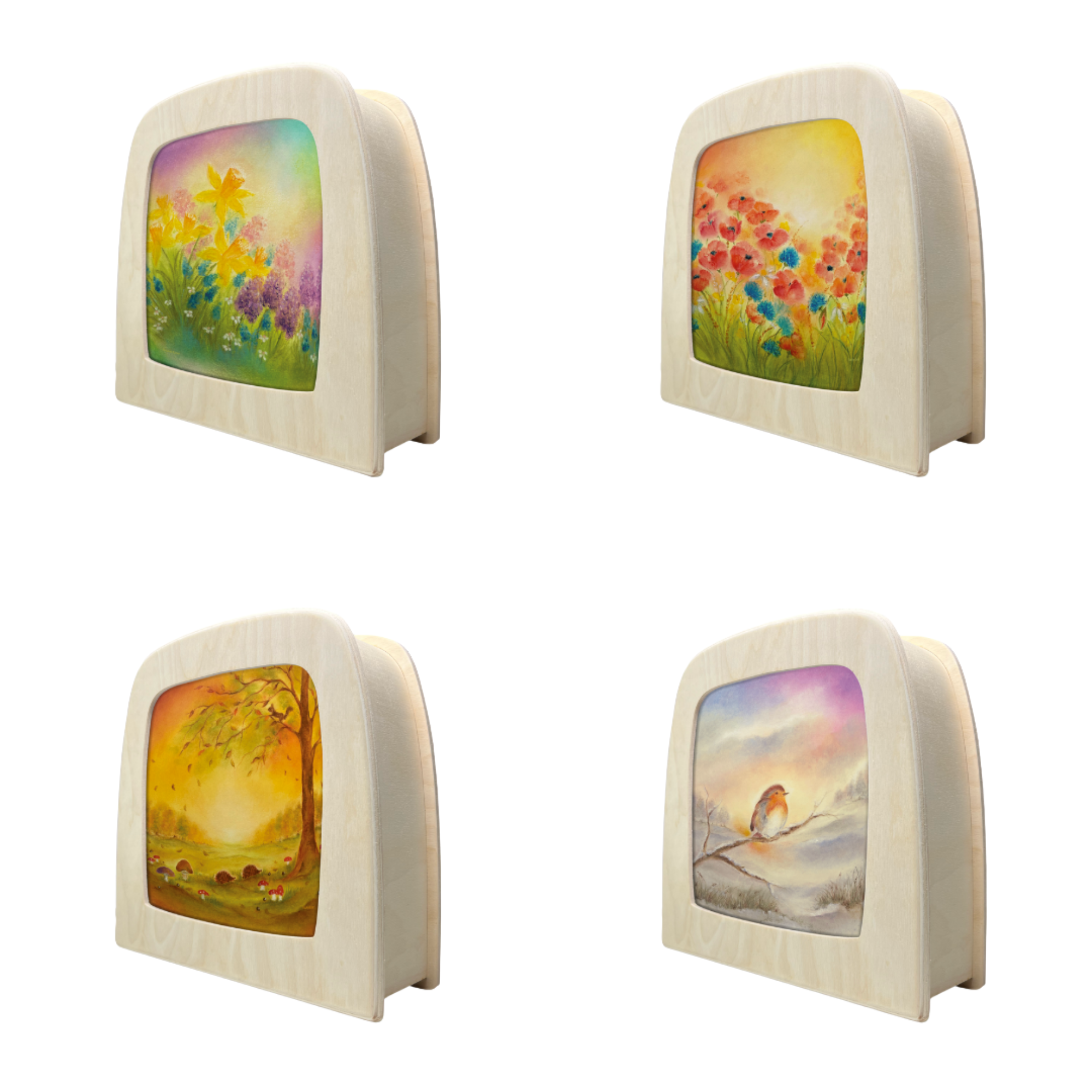V sadě najdete ručně vyráběnou dřevěnou lampu a čtyři vyměnitelná stínítka vybraná tak, abyste si mohli užívat kouzelnou atmosféru v každém ročním období. Stačí lampu zapojit, stisknout vypínač a nechat kouzlo rozsvítit váš svět. Sada je dodávána v pevném bavlněném dárkovém sáčku.