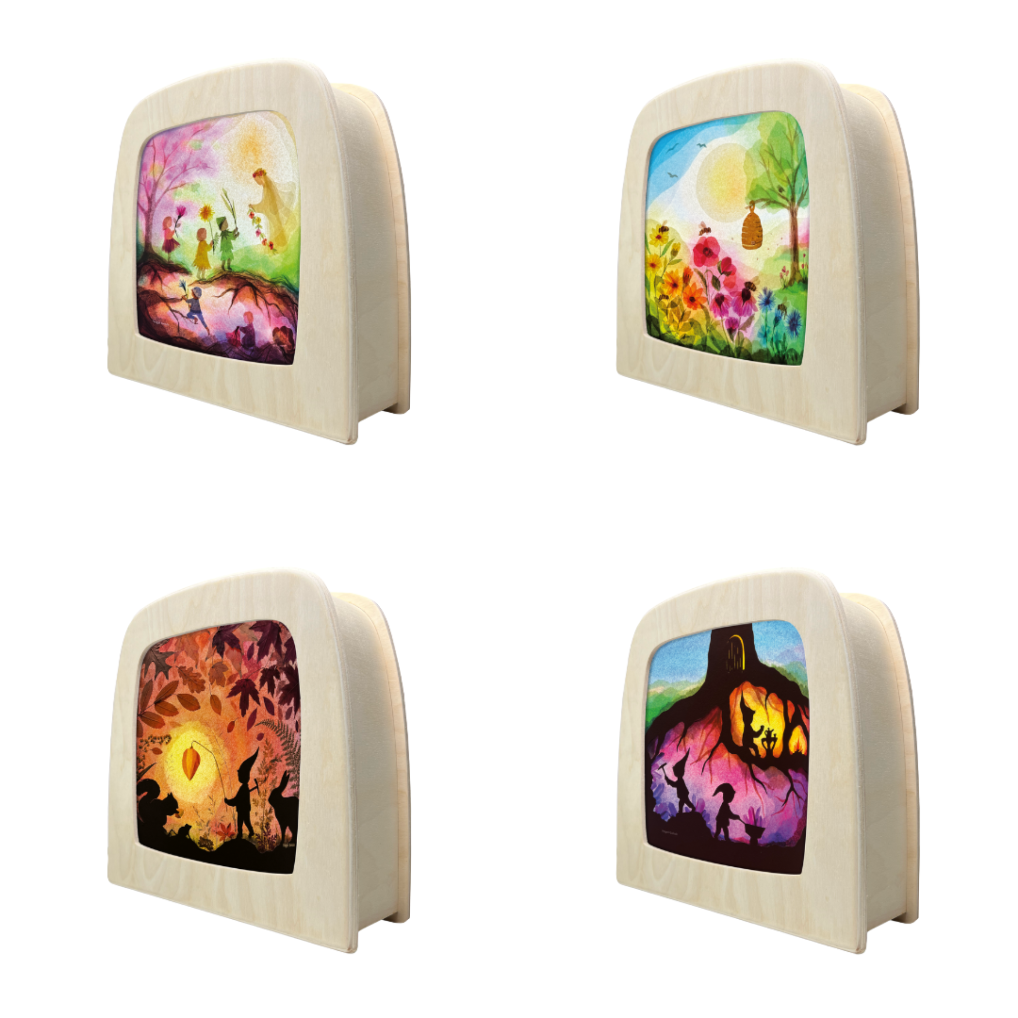 V sadě najdete ručně vyráběnou dřevěnou lampu a čtyři vyměnitelná stínítka vybraná tak, abyste si mohli užívat kouzelnou atmosféru v každém ročním období. Stačí lampu zapojit, stisknout vypínač a nechat světlo probudit kouzlo vašeho prostoru. Sada je dodávána v pevném bavlněném dárkovém sáčku.