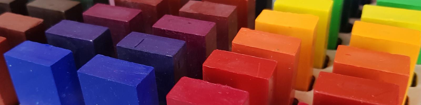 Ukázka kresby plochou či hranou bločku. Prolínání barev.