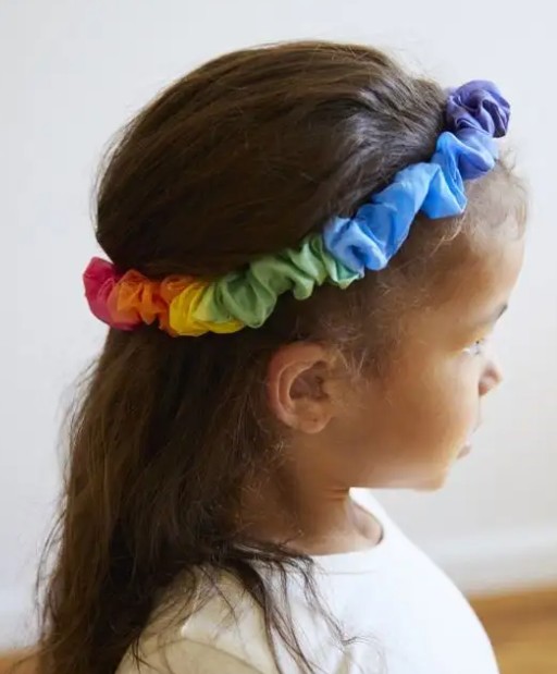 Součástí je pružný elastický pásek (obvod cca 45,5–71 cm), potažený 100% hedvábím, ručně malovaný a sítotiskem zdobený v originálních barevných kombinacích Sarah’s Silks. Girlanda je velmi pohodlná, jemná k pokožce a vhodná i pro citlivé děti.