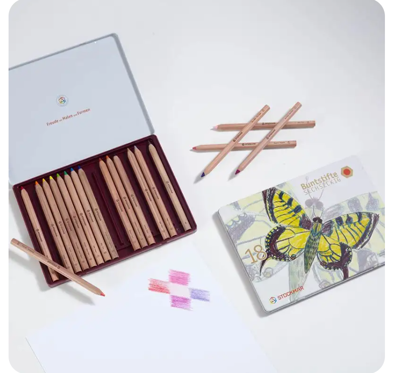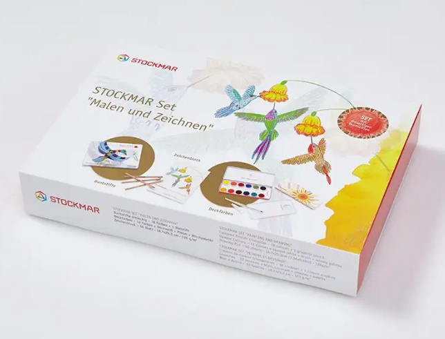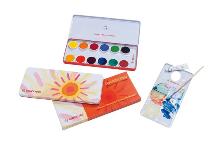 Krycí barvy Stockmar 12 odstínů v kvalitní kovové krabičce. Tóny jsou shodné se Stockmar akvarelovými barvami a mají velmi dobré krycí vlastnosti. Balení obsahuje kromě 12-ti odstínů barev i tubu krycí běloby, paletu a kvalitní štětec, který velmi dobře drží tvar. Paletu lze vyjmout z krabičky a umístit ji na potřebné místo a po ukončení malování velmi snadno omýt vodou. Stejně jako ostatní materiály firmy Stockmar mají i tyto krycí barvy jediněčnou světelnost, jež je dána vysokou koncentrací barevných pigmentů. Výsledkem je velmi intenzivní barva, která je silná i po zředění vodou. Krycí barvy lze využít kromě ke klasickému akvarelovému malování i k domalování detailů v obrazech namalovaných Stockmar akvarelovými barvami, dále pak k lazurovému malování či ke kombinaci více technik. Součástí balení je sada šestihranných dřevěných pastelek, 18ks. Balení dále obsahuje blok akvarelových papírů - 50ks, gramáž: 120gr, rozměr 18.7 x 25.3 cm