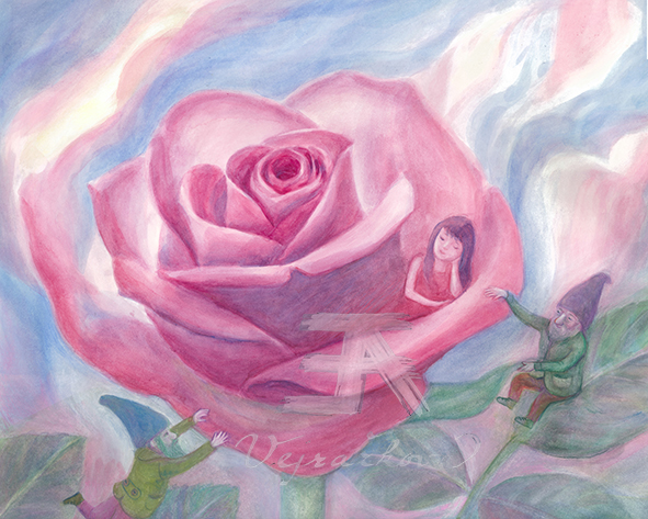 Tisky obrazů Evy Verjažkové, vytvořených vrstveným akvarelem, vznikaly během mnoha let. Autorka o svých obrazech píše: Vrstvený akvarel je časové náročná technika, která vyhovuje mému požadavku na rozsvícení barvy. Jemné závoje barev v rostlinných, figurálních a krajinných motivech vrstvím až do hlubokých, intenzivních tónů , aniž by barvou přestalo prostupovat světlo. U rostlinných motivů jsem v barevných skvrnách, obklopujících hlavní motiv, postupně začala objevovat elementární bytůstky, které stačilo jen zachytit.