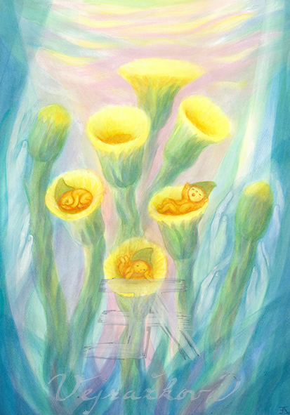 Tisky obrazů Evy Verjažkové, vytvořených vrstveným akvarelem, vznikaly během mnoha let. Autorka o svých obrazech píše: Vrstvený akvarel je časové náročná technika, která vyhovuje mému požadavku na rozsvícení barvy. Jemné závoje barev v rostlinných, figurálních a krajinných motivech vrstvím až do hlubokých, intenzivních tónů , aniž by barvou přestalo prostupovat světlo. U rostlinných motivů jsem v barevných skvrnách, obklopujících hlavní motiv, postupně začala objevovat elementární bytůstky, které stačilo jen zachytit.