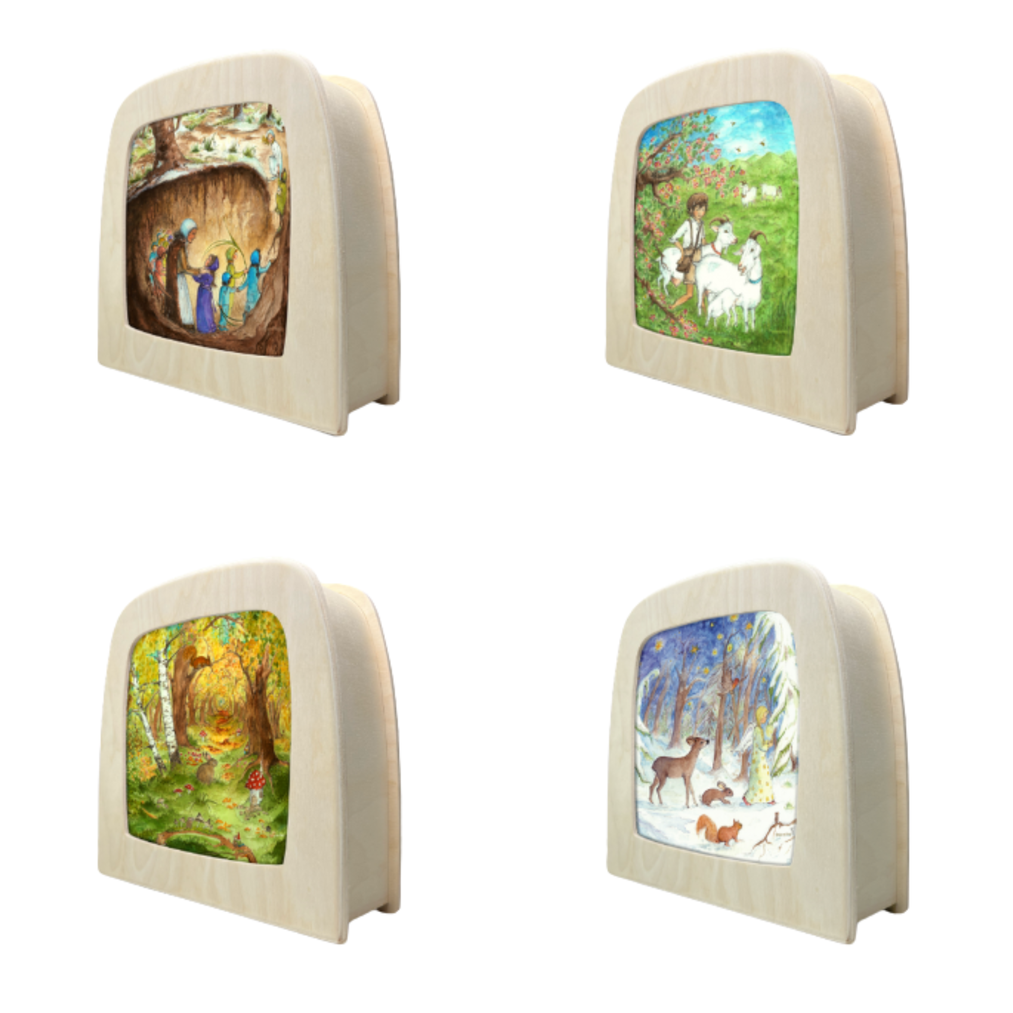 V sadě najdete ručně vyráběnou dřevěnou lampu a čtyři vyměnitelná stínítka s motivy přírody vybraná tak, abyste si mohli užívat kouzelnou atmosféru v každém ročním období. Stačí lampu zapojit, stisknout vypínač a nechat světlo probudit kouzlo vašeho prostoru. Sada je dodávána v pevném bavlněném dárkovém sáčku.