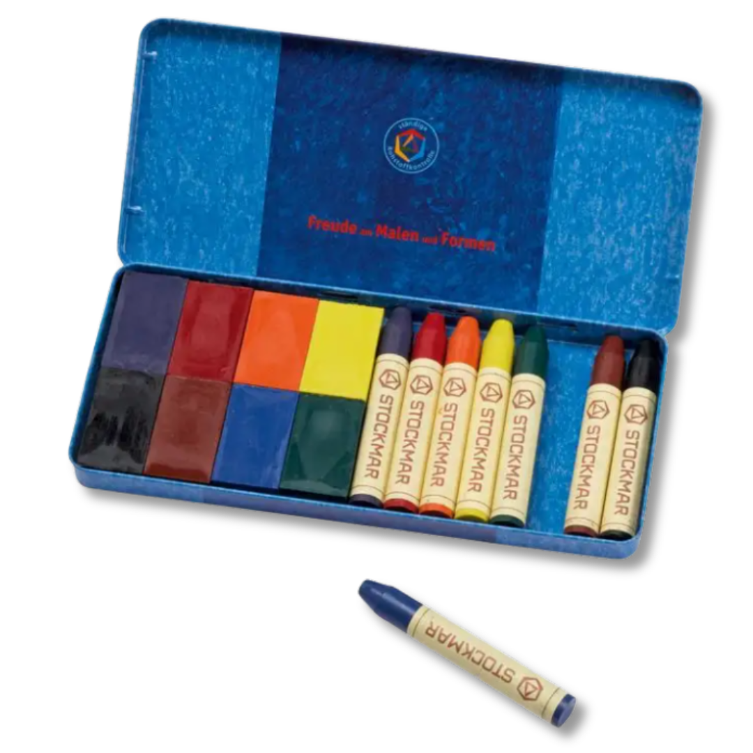 Sada Stockmar 8 bločků a 8 pastelek ve stejné barvě v plechové krabičce, 16ks. Složení barev - viz níže. Voskové bločky a pastelky splňují nejvyšší vzdělávací, estetické a umělecké nároky. Stockmar voskové bločky - elegantní design, atraktivní balení a příjemná vůně, to vše působí na smysly dítěte. Barvy se nádherně lesknou, díky transparentnosti je možné barvy míchat a použití je skutečně všestranné – kresba, malba, vrstvení, škrábání a tání barvy. Stockmar bločky slibují roky potěšení z tvorby i výsledku tvoření – výkresy nelepí, nerozmazávají se. Bločky jsou netoxické, nerozbitné, díky tvaru nekazí držení ruky, poskytují vše pro smysluplné vzdělání nejmenších i dětí školou povinných.